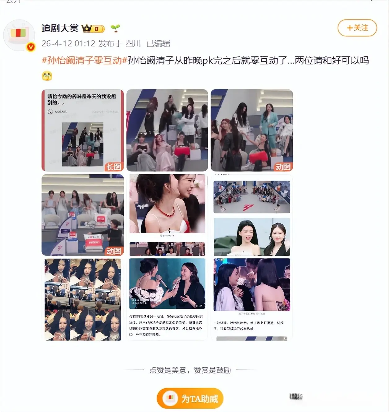 所以两人昨晚又挂了一夜的热搜,内容是“孙怡阚清子从昨晚PK完之后就零互动了.....”