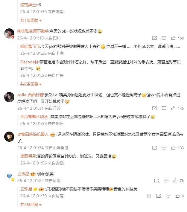 弹幕说,孙怡唱得好听,但是阚清子太可怜了,所以我要在现场也会把票投给她。